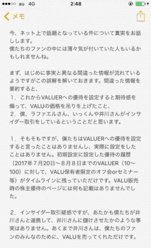 →優待すると言ったことは無く、実際に設定してもいない。出回っている優待画像は初期設定で設定したモノがVALUのタイムラインに残っていただけ。VALU販売時に優待のページには何も記載されていなかった。 - ②インサイダー取引疑惑について